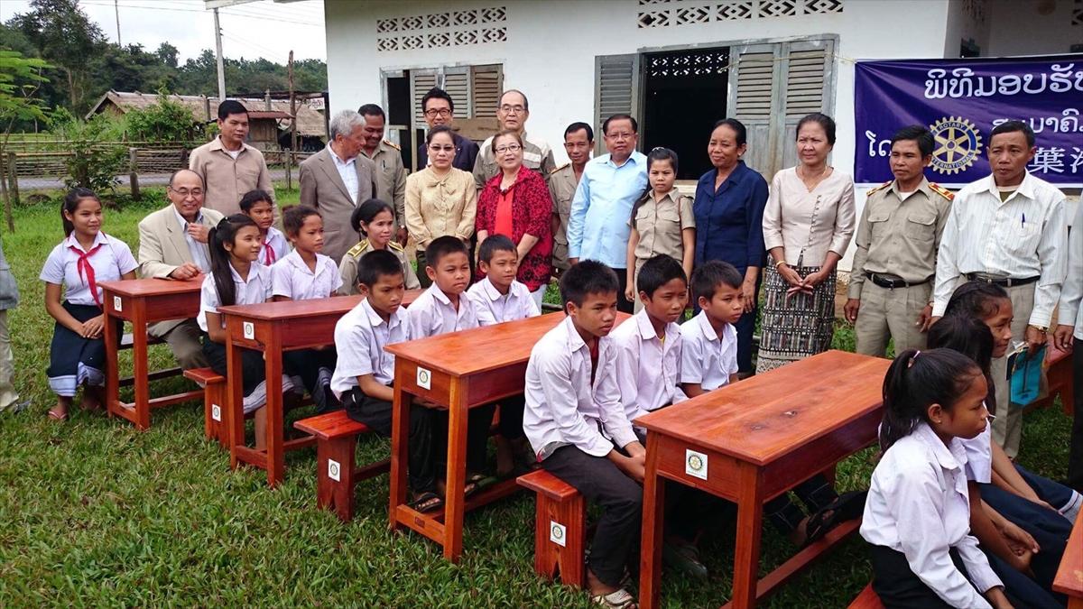 千葉港ロータリークラブが寄付をした机と椅子で喜ぶラオスの学生達。てっちゃんねっと・トレーニングセンター http://tetchan.net/