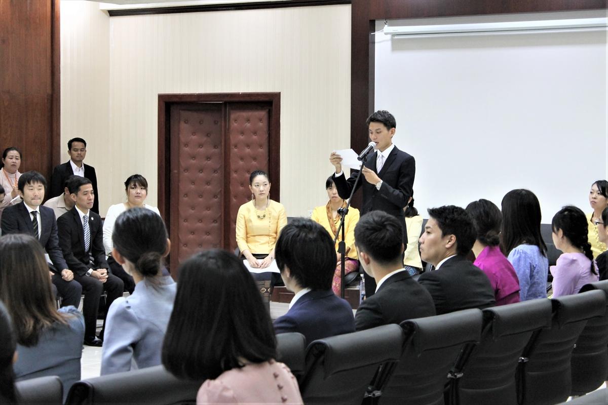 首相からの歓迎挨拶の後、首都に近いビエンチャン県バンクン教員養成校で理科を教えている矢野卓郎さんが、自身が担当する生物実験において「仮説、実験、結果、考察」の流れを大切にして指導している日頃の活動の報告や、これからもラオスの人たちと一緒に活動しながら自分たちの日本での経験を活かして、ラオスの発展のために貢献していきたいと抱負を述べた。