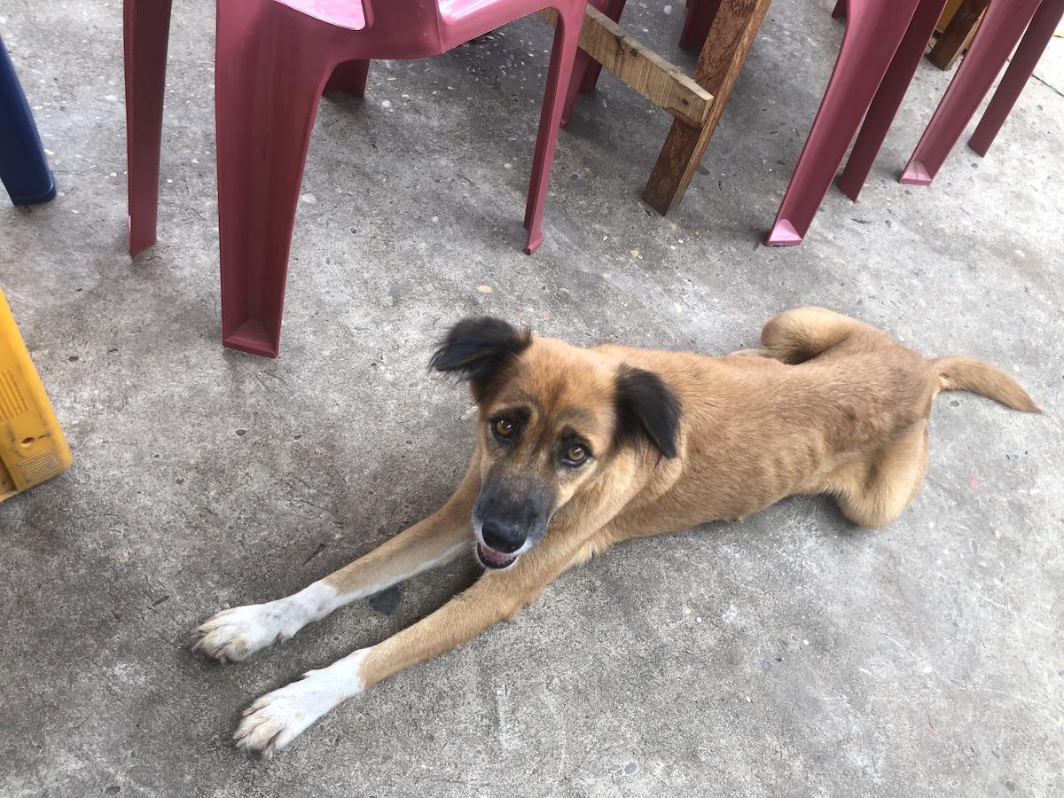タイもラオスも屋外の食堂には犬がつきまとう。しかし夜道で出会ったらは要注意だ。(そむちゃい吉田撮影)