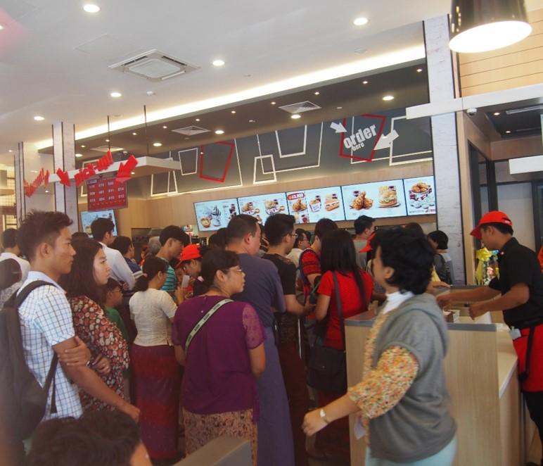 2015年7月12日、ミャンマー最大都市ヤンゴン市に6月30日にオープンしたKFC(ケンタッキーフライドチキン)第一号店では、フライドチキンを買い求める人の行列が一日中絶えない程の人気を博している。
