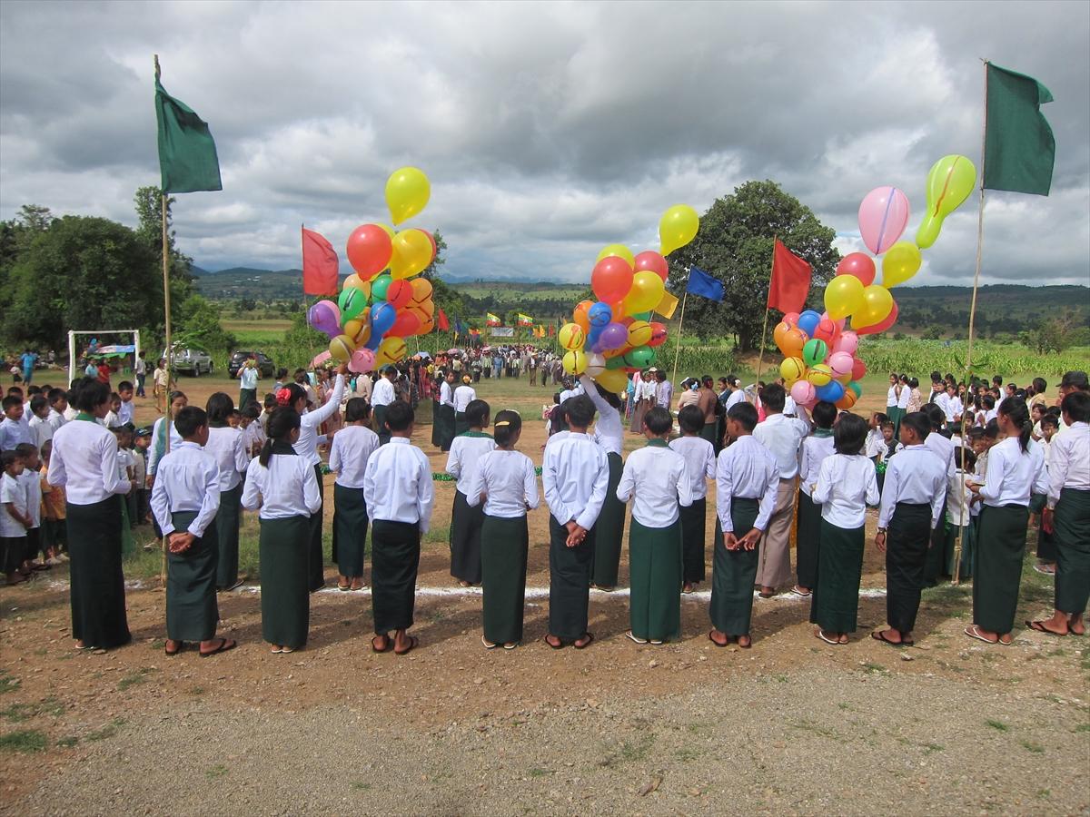 地域住民とNGOセダナーの2人3脚で建設した校舎の完成は、地域をあげて祝われる。2015年10月8日、シャン州の州都タウンジーから車で1時間半、レー・ドゥー村の新校舎引渡式典に参加した。126世帯756人のレー・ドゥー村は、ダヌー族50%、ビルマ族40%、パオ族10%の3つの少数民族で構成されている。色とりどりの民族衣装に身を包んだ住民・生徒が整列して、式典参加者を歓迎してくれた。打楽器の演奏と校庭に飾られたカラフルな旗や風船からも、新校舎完成に対する地域の喜びが伝わってくるようだ。