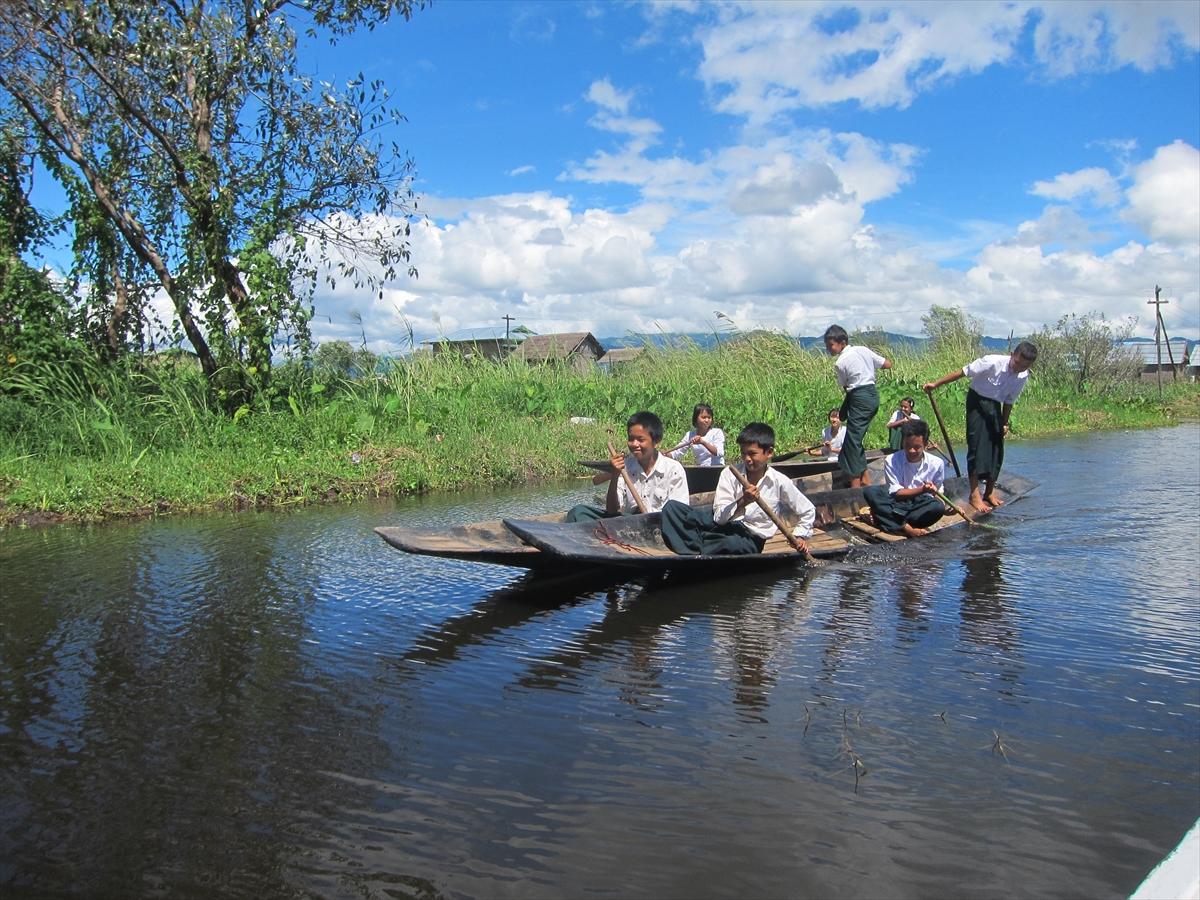 シャン州インレー湖上のインポーコンユワティッ中学校分校(※1)では、毎朝202名の生徒がボートで通学する。小学校高学年や中学生のお兄さんお姉さんが、小学校低中学年の子どもたち3-4人を乗せて漕ぐグループ登校だ。ボートから落ちても溺れないように、インレー湖畔で育つ子どもたちは小学校に入学する5歳頃までには泳げるようになるそうだ。そんなインポーコンユワティッ中学校分校で、校舎完成から3年半にわたり地域で取り組んでいる学校運営について話を聞いた。