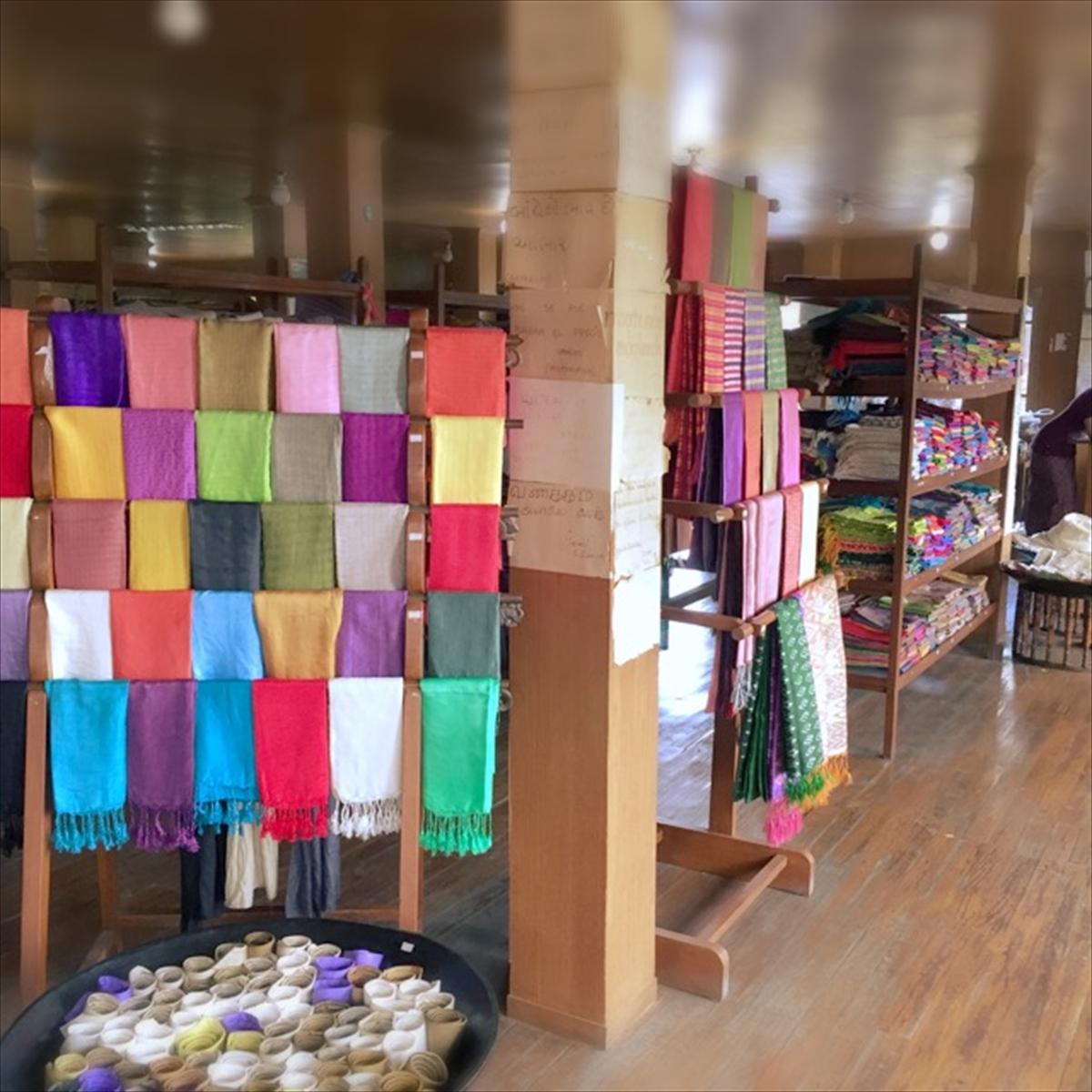 織物工房では、「ロンジー」やショール、蓮の糸で作ったロータスファブリックなどの織物製品が購入できる。