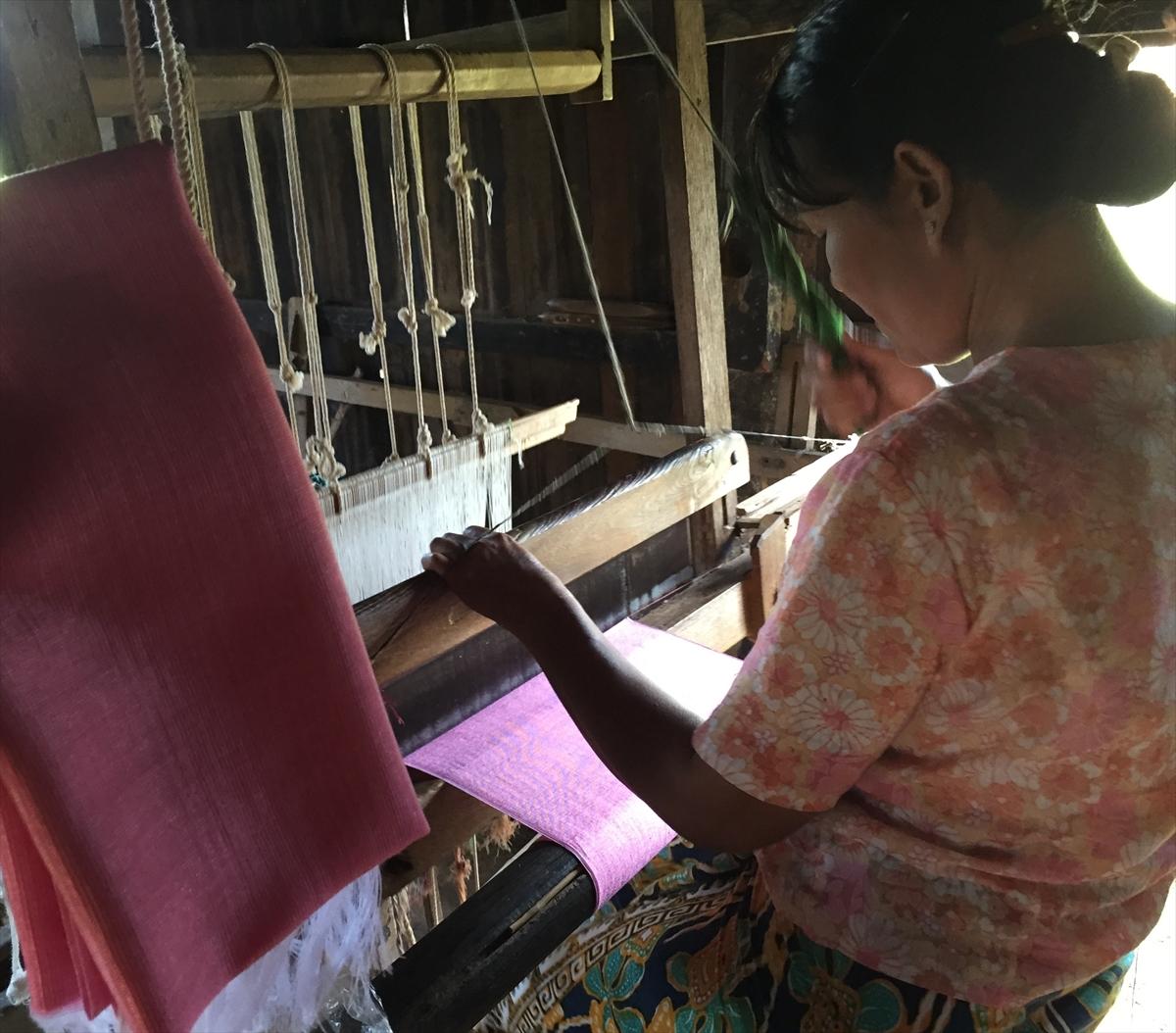 シャン高原最大の湖、インレー湖に浮かぶインポーコンユワティッ中学校分校では、学校運営に地域のマイクロファイナンス事業の収益を役立てている(※)。同校を訪れた際に、生徒のお母さん6人から養豚のマイクロファイナンス事業を含め、インレー湖での生活について伺ったところ、彼女たちは全員、織物業で家計を支えていることがわかった。家事や育児、インレー湖周辺の主要産業である農業の手伝い、そして学校運営のためのマイクロファイナンス事業の傍ら、ミャンマー伝統巻スカート「ロンジー」やショール、シャン州名物のカラフルな肩掛けバックの製作に携わっているお母さんたちを紹介したい。