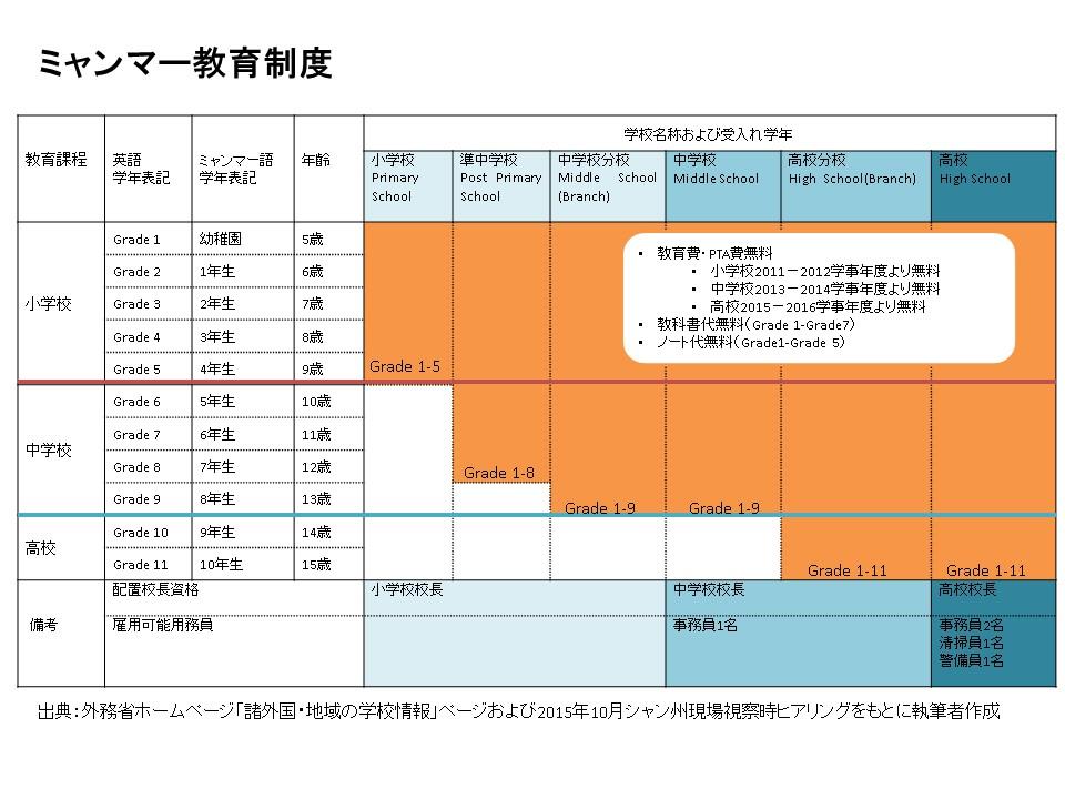 ミャンマーでは2011年以降、小中学校の授業料・教科書代の無料化とPTA費の補助金増額により、小中学校に通う生徒数が増加している。各村落にも、準中学校もしくは中学校分校(写真:「ミャンマー教育制度」参照)が設置され、中学課程までの教育環境は整いつつある。しかしながら、高校は設置数も少なく、遠く離れた村からの通学の負担が大きい。さらに、家庭の事情により、高校には進学せずに働くという選択をする生徒も少なくない。