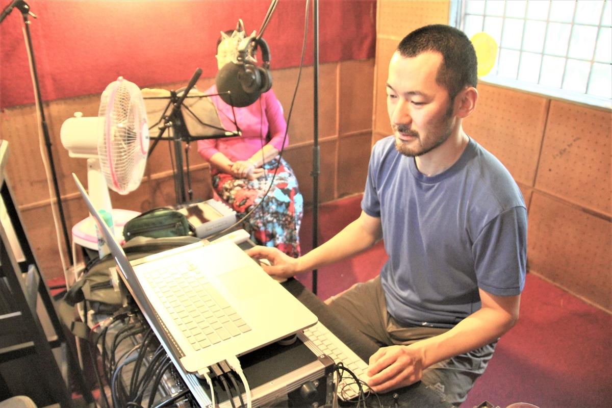 4月のある日、ヤンゴン郊外の音楽スタジオで、ミンライン氏はがポロンポロンと竪琴を奏で始めた。それに合わせ、年配の女性歌手がゆったりとした調子の歌を合わせる。釈迦が悟りを開くまでをなぞった歌詞だという。ある曲は緩やかで静かなメロディである一方で、リズミカルで躍動感のある曲もある。井口さんは曲を聞きながらパソコンの画面を操作して録音。音が自然にとれるように反響を弱めたり、マイクの位置を調整したりするなどして、日本水準の技術を生かしている。