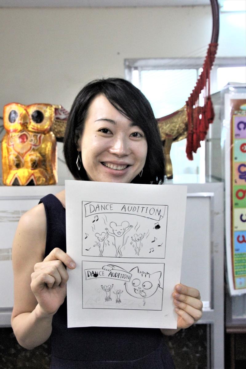 同日午前のワークショップには、6人のミャンマー人の男女が参加。ペンの使い方から始まり、2コマ漫画を制作した。「ネズミが踊る」という題をもとに、2コマの漫画を自ら考え作画する内容だ。自分でも「NARUTO」などの登場人物のイラストを描いていたというナンダーウーさん(23)は、ネズミが猫から隠れることに成功して踊っているという漫画を描いた。ペン入れを終えると「絵を描くのが慣れてないので難しかったけど、すごく楽しかった。これから自分で勉強してストーリー漫画を描きたい」と笑顔を浮かべた。