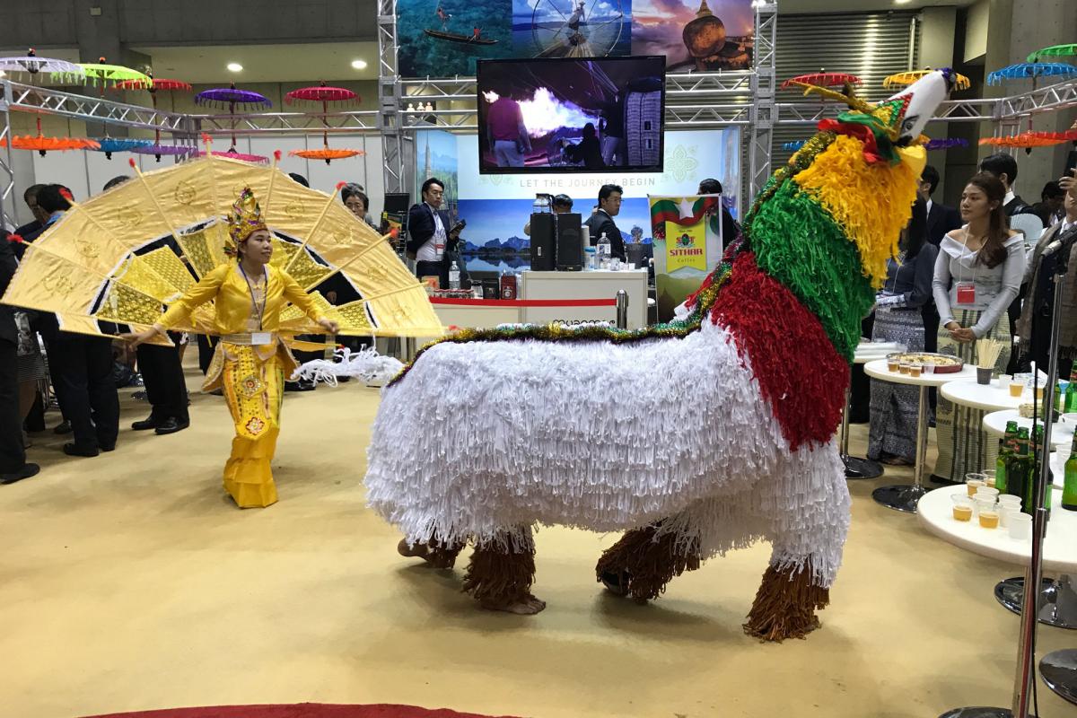 ミャンマーブースは、22日の内覧会では多くのメディアやプレス、来場者で溢れて賑わっていた。会場正面の特設ステージでは、ミャンマー舞踊、獅子舞を披露。華麗なダンスで会場に華を添えた。