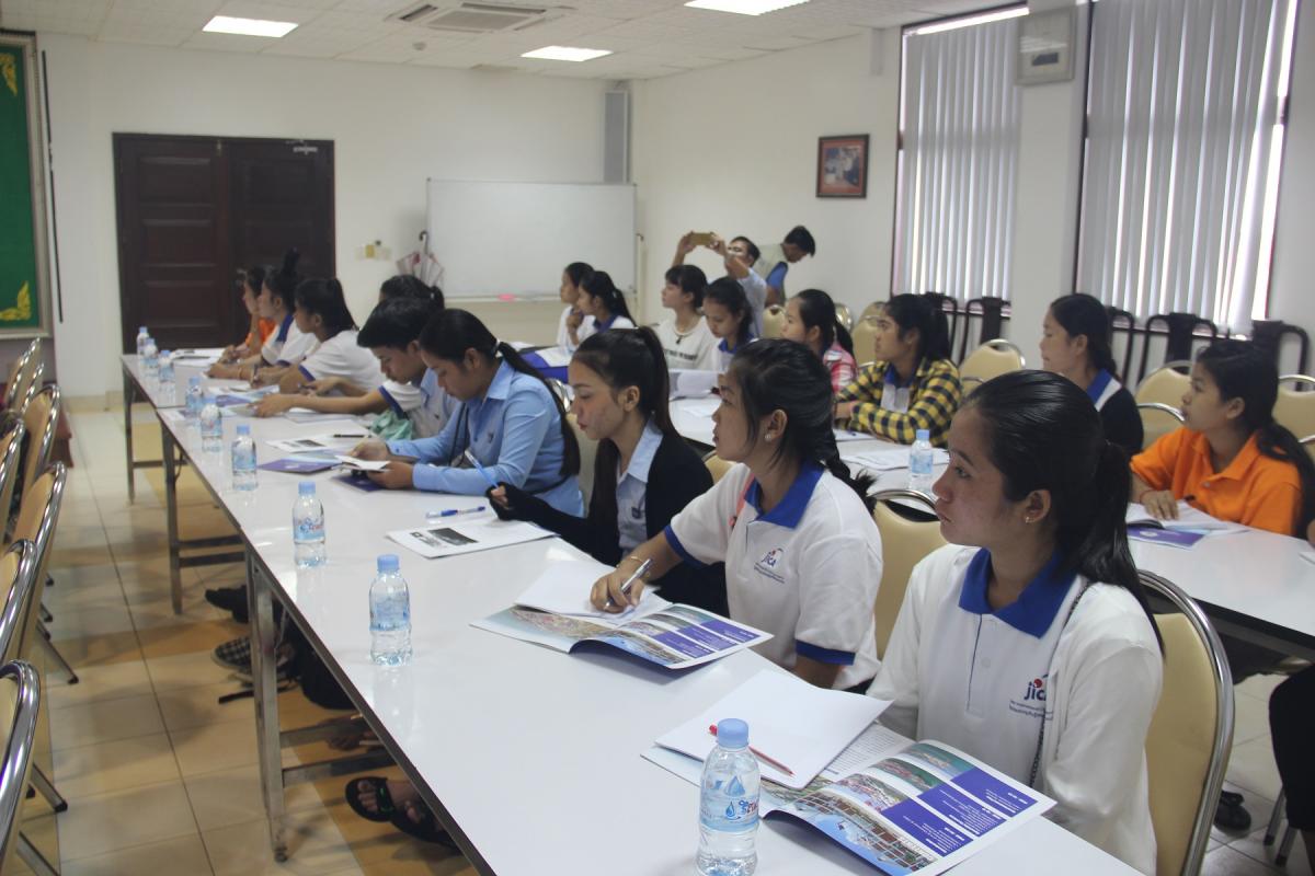ツアーには、プレア・シアヌーク州の小学校 教員養成校の生徒と、同州内にあるビルドブライト大学の学生合計47人が参加しました。前日には両校でJICAについて知ってもらうPRセミナーが開かれ、そこでのクイズで選抜された学 生たちです。「先生の卵」である養成校の生徒たちには、将来の教え子たちにも正しい情報が伝わるように、また、国際援助にあまりなじみのない私立大学の学生たちにもJICAを理解してもらいたい、という思いがあり、この2校がツアー招待の対象となりました。