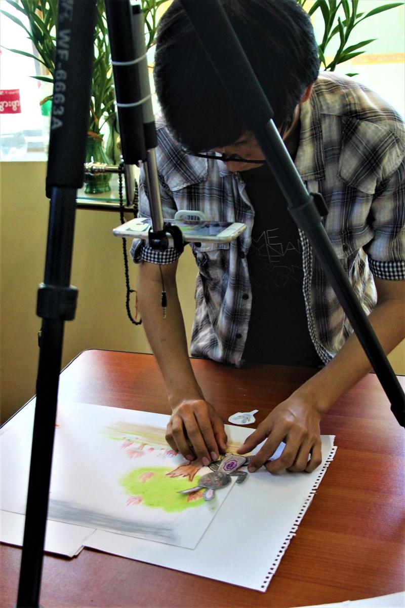 ワークショップにはアニメや漫画で日本語を学ぶ「オタク日本語クラブ」が協力。スマートフォンのアプリを利用して、画用紙で作った人形を少しずつ動かす様子を撮影、短いアニメ動画を制作した。受講者はミャンマーのだるまや、カップルが嫌いなペンギンなど思い思いのキャラクターを創作、音符を飛ばして歌を表現するなど工夫しながら、アニメを作り上げた。