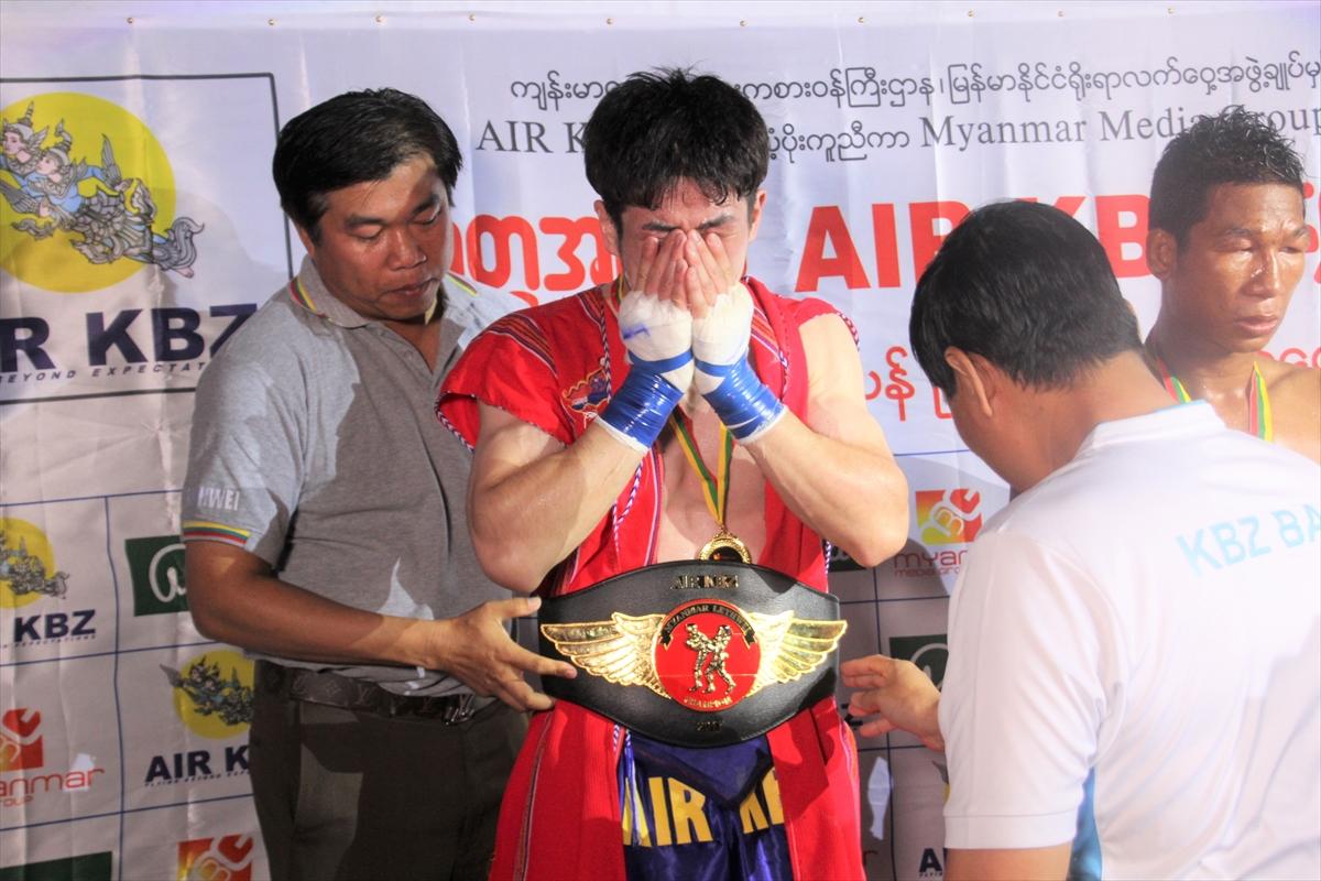 昨年12月、ベルトを手にして涙する金子大輝選手(ヤンゴン、撮影:北角裕樹)