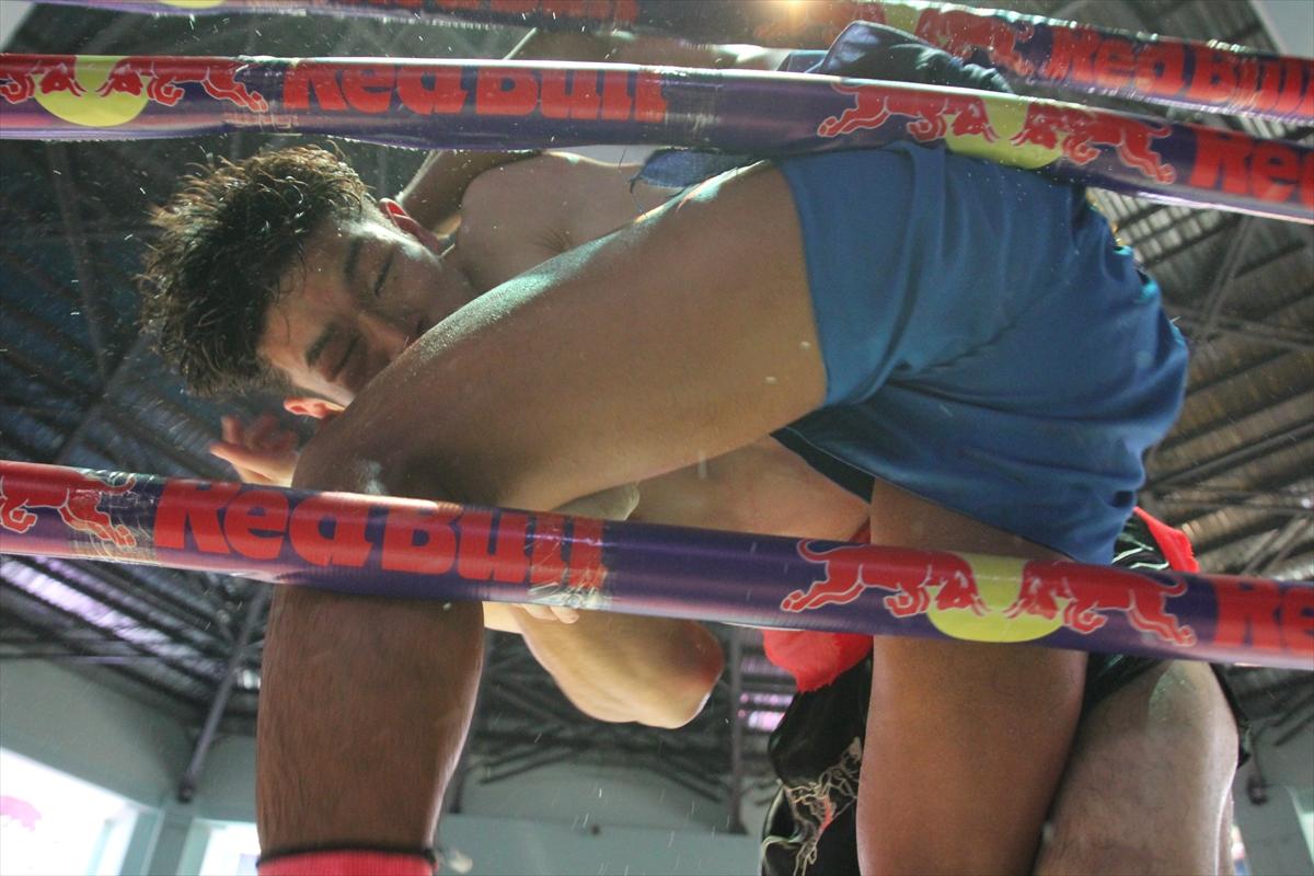 頭を押さえ込まれての膝蹴りを受ける金子選手(ヤンゴン、撮影:北角裕樹)