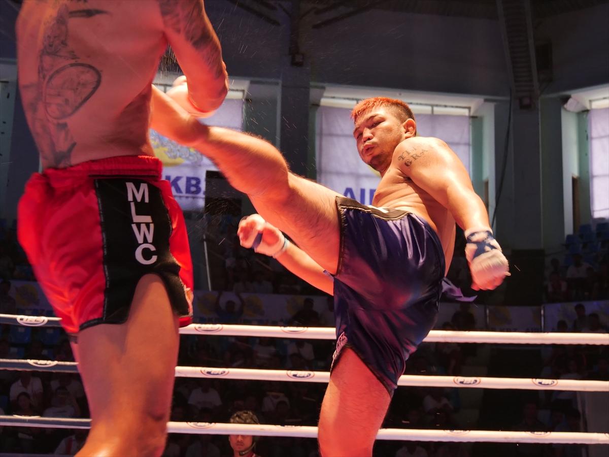 三日月蹴りを放つ渡慶次選手(ヤンゴン、撮影:北角裕樹)