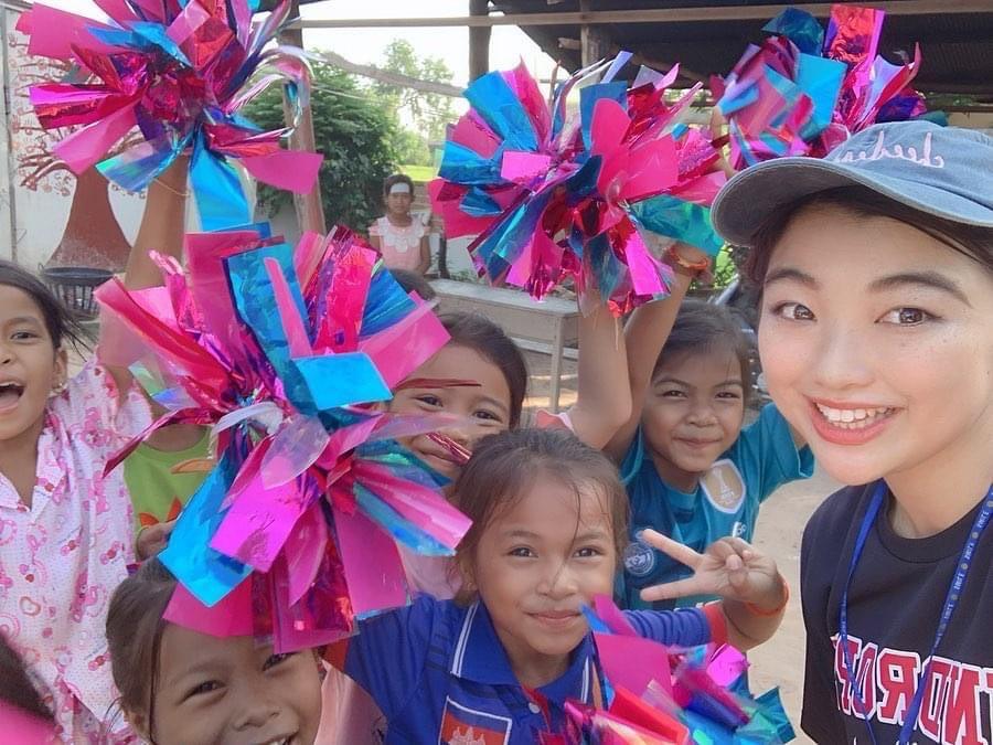 井上紗奈江さんは「チアは人に元気を与えるスポーツ。国際協力に興味を持ち始めた頃から、チアを活かせると考えていました。2019年7月にカンボジア・シェムリアップにある小学校を訪問し、ポンポンを寄付しチアを教えました。この時の子ども達の心から出る笑顔に感動しました。現在はオンラインZOOMを通して、カンボジアにある孤児院の子どもたちにチアダンスのレッスンを行っています。12月には、これからの活動について発表する予定です」と話す。