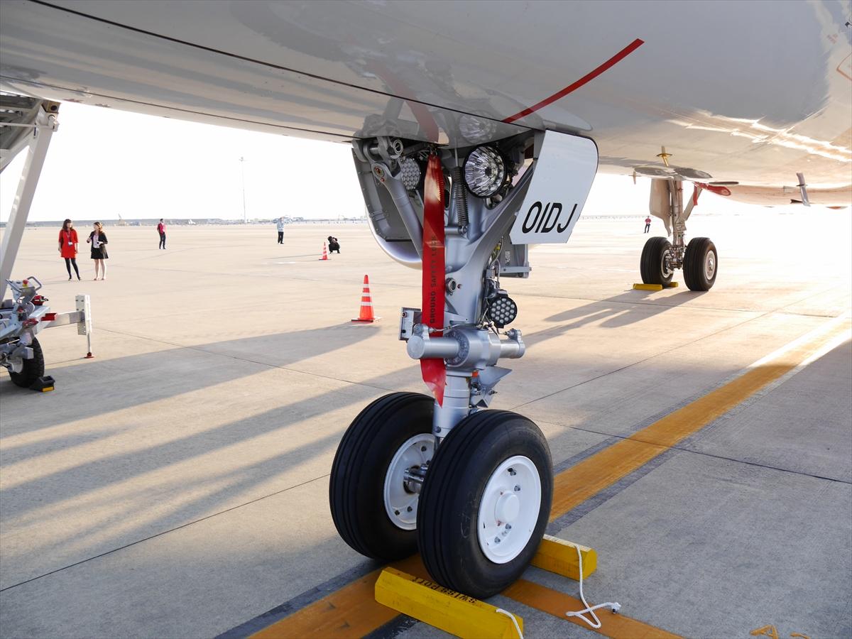 エア・アジアジャパンのエアバスA320型機 前輪アーム部分のライトは、最新のLEDが使われており、細かな点でのバージョンアップが日々行われ進化している。(https://youtu.be/q_OJmfAKHSc A320初号機動画)