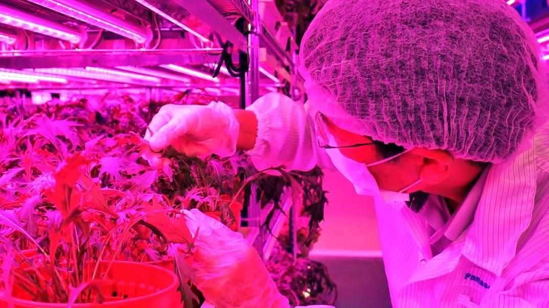 ピンクのLED照明で、葉物野菜を作る、シンガポールのパナソニック野菜工場。国土の狭いシンガポールには、最適なシステムだ。天候の影響を受けない安定的な供給が見込める。