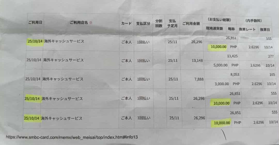 ところが翌日、三井住友カードの利用明細を確認すると、しっかり「海外キャッシングサービス利用」として26,851円が記録されていました。