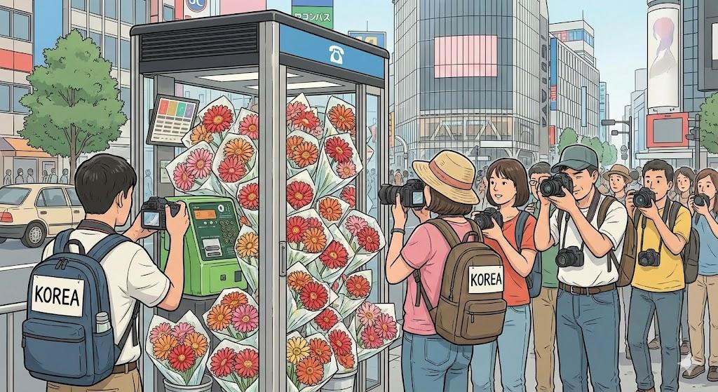 日本人だけでなく、韓国人も大勢着ている。承認欲求のためにSNSに「韓国から来ました」をUPしている。ファンの愛である、ガーベラの花が電話ボックスを埋め尽くしているとも照会している。
